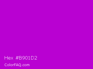 Hex #b901d2 Color is a normal magenta color and the nearest color is Deep Magenta #cc00cc. Hex code #b901d2 and RGB value is rgb(185,1,210). In RGB color space, this color is composed of 73% red, 0% green, 82% blue, In CMYK color space, this color is composed of 12% cyan, 100% magenta, 0% yellow , 18% black , In HSL color space, this color has a hue angle of 293° , 99% saturation and 41% lightness.