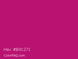 Hex #b91271 Color is a normal magenta color and the nearest color is Magenta Dye #ca1f7b. Hex code #b91271 and RGB value is rgb(185,18,113). In RGB color space, this color is composed of 73% red, 7% green, 44% blue, In CMYK color space, this color is composed of 0% cyan, 90% magenta, 39% yellow , 27% black , In HSL color space, this color has a hue angle of 326° , 82% saturation and 40% lightness.