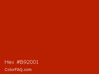 Hex #b92001 Color is a normal red color and the nearest color is International Orange Engineering #ba160c. Hex code #b92001 and RGB value is rgb(185,32,1). In RGB color space, this color is composed of 73% red, 13% green, 0% blue, In CMYK color space, this color is composed of 0% cyan, 83% magenta, 99% yellow , 27% black , In HSL color space, this color has a hue angle of 10° , 99% saturation and 36% lightness.