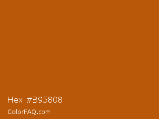 Hex #b95808 Color is a normal orange color and the nearest color is Rose Of Sharon #bf5500. Hex code #b95808 and RGB value is rgb(185,88,8). In RGB color space, this color is composed of 73% red, 35% green, 3% blue, In CMYK color space, this color is composed of 0% cyan, 52% magenta, 96% yellow , 27% black , In HSL color space, this color has a hue angle of 27° , 92% saturation and 38% lightness.