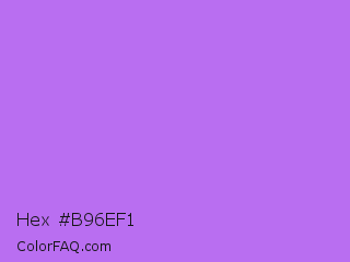 Hex #b96ef1 Color is a light purple color and the nearest color is Lavender #b57edc. Hex code #b96ef1 and RGB value is rgb(185,110,241). In RGB color space, this color is composed of 73% red, 43% green, 95% blue, In CMYK color space, this color is composed of 23% cyan, 54% magenta, 0% yellow , 5% black , In HSL color space, this color has a hue angle of 274° , 82% saturation and 69% lightness.