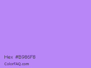 Hex #b986f8 Color is a light violet color and the nearest color is Bright Lavender #bf94e4. Hex code #b986f8 and RGB value is rgb(185,134,248). In RGB color space, this color is composed of 73% red, 53% green, 97% blue, In CMYK color space, this color is composed of 25% cyan, 46% magenta, 0% yellow , 3% black , In HSL color space, this color has a hue angle of 267° , 89% saturation and 75% lightness.