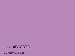 Hex #b988bb Color is a light magenta color and the nearest color is African Violet #b284be. Hex code #b988bb and RGB value is rgb(185,136,187). In RGB color space, this color is composed of 73% red, 53% green, 73% blue, In CMYK color space, this color is composed of 1% cyan, 27% magenta, 0% yellow , 27% black , In HSL color space, this color has a hue angle of 298° , 27% saturation and 63% lightness.