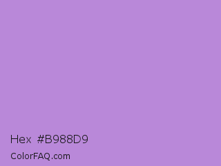 Hex #b988d9 Color is a light purple color and the nearest color is Lavender #b57edc. Hex code #b988d9 and RGB value is rgb(185,136,217). In RGB color space, this color is composed of 73% red, 53% green, 85% blue, In CMYK color space, this color is composed of 15% cyan, 37% magenta, 0% yellow , 15% black , In HSL color space, this color has a hue angle of 276° , 52% saturation and 69% lightness.