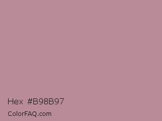 Hex #b98b97 Color is a light rose color and the nearest color is Rosy Brown #bc8f8f. Hex code #b98b97 and RGB value is rgb(185,139,151). In RGB color space, this color is composed of 73% red, 55% green, 59% blue, In CMYK color space, this color is composed of 0% cyan, 25% magenta, 18% yellow , 27% black , In HSL color space, this color has a hue angle of 344° , 25% saturation and 64% lightness.