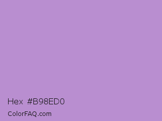 Hex #b98ed0 Color is a light purple color and the nearest color is East Side #ac91ce. Hex code #b98ed0 and RGB value is rgb(185,142,208). In RGB color space, this color is composed of 73% red, 56% green, 82% blue, In CMYK color space, this color is composed of 11% cyan, 32% magenta, 0% yellow , 18% black , In HSL color space, this color has a hue angle of 279° , 41% saturation and 69% lightness.