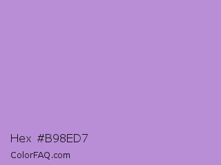 Hex #b98ed7 Color is a light purple color and the nearest color is Bright Lavender #bf94e4. Hex code #b98ed7 and RGB value is rgb(185,142,215). In RGB color space, this color is composed of 73% red, 56% green, 84% blue, In CMYK color space, this color is composed of 14% cyan, 34% magenta, 0% yellow , 16% black , In HSL color space, this color has a hue angle of 275° , 48% saturation and 70% lightness.