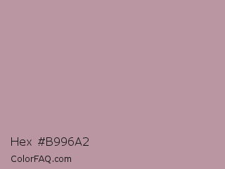 Hex #b996a2 Color is a light rose color and the nearest color is Tuscany #c09999. Hex code #b996a2 and RGB value is rgb(185,150,162). In RGB color space, this color is composed of 73% red, 59% green, 64% blue, In CMYK color space, this color is composed of 0% cyan, 19% magenta, 12% yellow , 27% black , In HSL color space, this color has a hue angle of 339° , 20% saturation and 66% lightness.