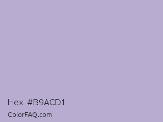 Hex #b9acd1 Color is a light violet color and the nearest color is Chatelle #bdb3c7. Hex code #b9acd1 and RGB value is rgb(185,172,209). In RGB color space, this color is composed of 73% red, 67% green, 82% blue, In CMYK color space, this color is composed of 11% cyan, 18% magenta, 0% yellow , 18% black , In HSL color space, this color has a hue angle of 261° , 29% saturation and 75% lightness.