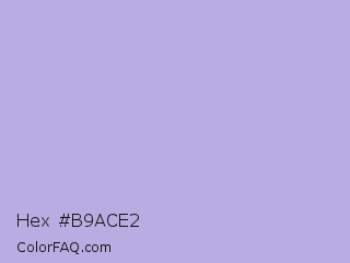 Hex #b9ace2 Color is a light indigo color and the nearest color is Maximum Blue Purple #acace6. Hex code #b9ace2 and RGB value is rgb(185,172,226). In RGB color space, this color is composed of 73% red, 67% green, 89% blue, In CMYK color space, this color is composed of 18% cyan, 24% magenta, 0% yellow , 11% black , In HSL color space, this color has a hue angle of 254° , 48% saturation and 78% lightness.