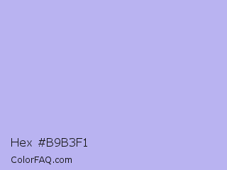 Hex #b9b3f1 Color is a very light indigo color and the nearest color is Maximum Blue Purple #acace6. Hex code #b9b3f1 and RGB value is rgb(185,179,241). In RGB color space, this color is composed of 73% red, 70% green, 95% blue, In CMYK color space, this color is composed of 23% cyan, 26% magenta, 0% yellow , 5% black , In HSL color space, this color has a hue angle of 246° , 69% saturation and 82% lightness.