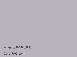 Hex #b9b4bb Color is a light purple color and the nearest color is Pink Swan #beb5b7. Hex code #b9b4bb and RGB value is rgb(185,180,187). In RGB color space, this color is composed of 73% red, 71% green, 73% blue, In CMYK color space, this color is composed of 1% cyan, 4% magenta, 0% yellow , 27% black , In HSL color space, this color has a hue angle of 283° , 5% saturation and 72% lightness.