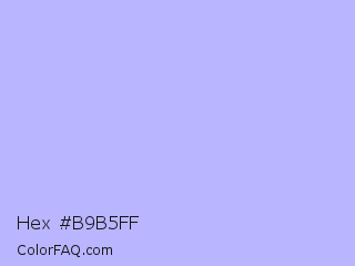 Hex #b9b5ff Color is a very light indigo color and the nearest color is Melrose #c7c1ff. Hex code #b9b5ff and RGB value is rgb(185,181,255). In RGB color space, this color is composed of 73% red, 71% green, 100% blue, In CMYK color space, this color is composed of 27% cyan, 29% magenta, 0% yellow , 0% black , In HSL color space, this color has a hue angle of 243° , 100% saturation and 85% lightness.