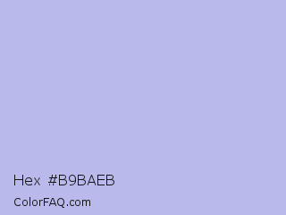 Hex #b9baeb Color is a very light blue color and the nearest color is Perano #a9bef2. Hex code #b9baeb and RGB value is rgb(185,186,235). In RGB color space, this color is composed of 73% red, 73% green, 92% blue, In CMYK color space, this color is composed of 21% cyan, 21% magenta, 0% yellow , 8% black , In HSL color space, this color has a hue angle of 239° , 56% saturation and 82% lightness.