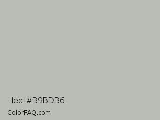 Hex #b9bdb6 Color is a light green color and the nearest color is Green Spring #b8c1b1. Hex code #b9bdb6 and RGB value is rgb(185,189,182). In RGB color space, this color is composed of 73% red, 74% green, 71% blue, In CMYK color space, this color is composed of 2% cyan, 0% magenta, 4% yellow , 26% black , In HSL color space, this color has a hue angle of 94° , 5% saturation and 73% lightness.