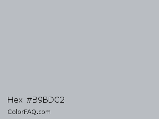 Hex #b9bdc2 Color is a light blue color and the nearest color is French Gray #bdbdc6. Hex code #b9bdc2 and RGB value is rgb(185,189,194). In RGB color space, this color is composed of 73% red, 74% green, 76% blue, In CMYK color space, this color is composed of 5% cyan, 3% magenta, 0% yellow , 24% black , In HSL color space, this color has a hue angle of 213° , 7% saturation and 74% lightness.
