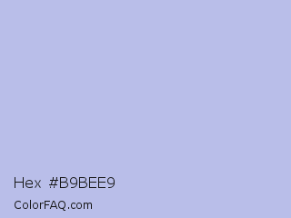 Hex #b9bee9 Color is a very light blue color and the nearest color is Light Steel Blue #b0c4de. Hex code #b9bee9 and RGB value is rgb(185,190,233). In RGB color space, this color is composed of 73% red, 75% green, 91% blue, In CMYK color space, this color is composed of 21% cyan, 18% magenta, 0% yellow , 9% black , In HSL color space, this color has a hue angle of 234° , 52% saturation and 82% lightness.