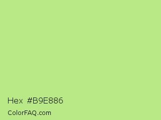 Hex #b9e886 Color is a light green color and the nearest color is Sulu #c1f07c. Hex code #b9e886 and RGB value is rgb(185,232,134). In RGB color space, this color is composed of 73% red, 91% green, 53% blue, In CMYK color space, this color is composed of 20% cyan, 0% magenta, 42% yellow , 9% black , In HSL color space, this color has a hue angle of 89° , 68% saturation and 72% lightness.