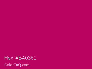 Hex #ba0361 Color is a normal rose color and the nearest color is Lipstick #ab0563. Hex code #ba0361 and RGB value is rgb(186,3,97). In RGB color space, this color is composed of 73% red, 1% green, 38% blue, In CMYK color space, this color is composed of 0% cyan, 98% magenta, 48% yellow , 27% black , In HSL color space, this color has a hue angle of 329° , 97% saturation and 37% lightness.