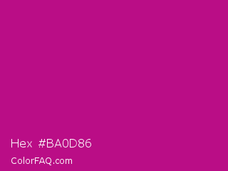Hex #ba0d86 Color is a normal magenta color and the nearest color is Red Violet #c71585. Hex code #ba0d86 and RGB value is rgb(186,13,134). In RGB color space, this color is composed of 73% red, 5% green, 53% blue, In CMYK color space, this color is composed of 0% cyan, 93% magenta, 28% yellow , 27% black , In HSL color space, this color has a hue angle of 318° , 87% saturation and 39% lightness.