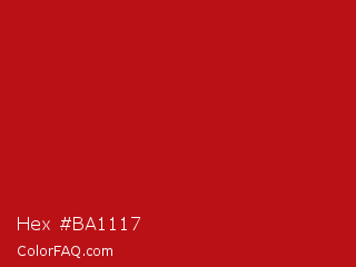 Hex #ba1117 Color is a normal red color and the nearest color is International Orange Engineering #ba160c. Hex code #ba1117 and RGB value is rgb(186,17,23). In RGB color space, this color is composed of 73% red, 7% green, 9% blue, In CMYK color space, this color is composed of 0% cyan, 91% magenta, 88% yellow , 27% black , In HSL color space, this color has a hue angle of 358° , 83% saturation and 40% lightness.