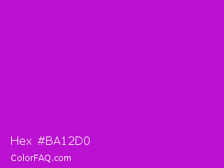 Hex #ba12d0 Color is a normal magenta color and the nearest color is Vivid Mulberry #b80ce3. Hex code #ba12d0 and RGB value is rgb(186,18,208). In RGB color space, this color is composed of 73% red, 7% green, 82% blue, In CMYK color space, this color is composed of 11% cyan, 91% magenta, 0% yellow , 18% black , In HSL color space, this color has a hue angle of 293° , 84% saturation and 44% lightness.