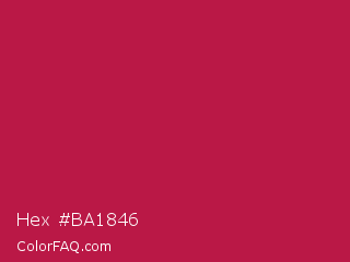 Hex #ba1846 Color is a normal rose color and the nearest color is Maroon Flush #c32148. Hex code #ba1846 and RGB value is rgb(186,24,70). In RGB color space, this color is composed of 73% red, 9% green, 27% blue, In CMYK color space, this color is composed of 0% cyan, 87% magenta, 62% yellow , 27% black , In HSL color space, this color has a hue angle of 343° , 77% saturation and 41% lightness.