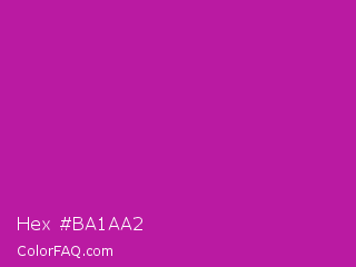 Hex #ba1aa2 Color is a normal magenta color and the nearest color is Byzantine #bd33a4. Hex code #ba1aa2 and RGB value is rgb(186,26,162). In RGB color space, this color is composed of 73% red, 10% green, 64% blue, In CMYK color space, this color is composed of 0% cyan, 86% magenta, 13% yellow , 27% black , In HSL color space, this color has a hue angle of 309° , 75% saturation and 42% lightness.