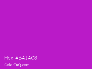Hex #ba1ac8 Color is a normal magenta color and the nearest color is Vivid Mulberry #b80ce3. Hex code #ba1ac8 and RGB value is rgb(186,26,200). In RGB color space, this color is composed of 73% red, 10% green, 78% blue, In CMYK color space, this color is composed of 7% cyan, 87% magenta, 0% yellow , 22% black , In HSL color space, this color has a hue angle of 295° , 77% saturation and 44% lightness.