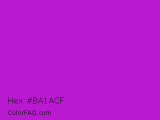 Hex #ba1acf Color is a normal magenta color and the nearest color is Vivid Mulberry #b80ce3. Hex code #ba1acf and RGB value is rgb(186,26,207). In RGB color space, this color is composed of 73% red, 10% green, 81% blue, In CMYK color space, this color is composed of 10% cyan, 87% magenta, 0% yellow , 19% black , In HSL color space, this color has a hue angle of 293° , 78% saturation and 46% lightness.