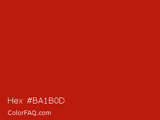 Hex #ba1b0d Color is a normal red color and the nearest color is International Orange Engineering #ba160c. Hex code #ba1b0d and RGB value is rgb(186,27,13). In RGB color space, this color is composed of 73% red, 11% green, 5% blue, In CMYK color space, this color is composed of 0% cyan, 85% magenta, 93% yellow , 27% black , In HSL color space, this color has a hue angle of 5° , 87% saturation and 39% lightness.