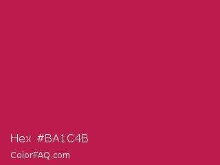 Hex #ba1c4b Color is a normal rose color and the nearest color is Maroon Flush #c32148. Hex code #ba1c4b and RGB value is rgb(186,28,75). In RGB color space, this color is composed of 73% red, 11% green, 29% blue, In CMYK color space, this color is composed of 0% cyan, 85% magenta, 60% yellow , 27% black , In HSL color space, this color has a hue angle of 342° , 74% saturation and 42% lightness.