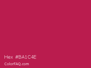 Hex #ba1c4e Color is a normal rose color and the nearest color is Rose Red #c21e56. Hex code #ba1c4e and RGB value is rgb(186,28,78). In RGB color space, this color is composed of 73% red, 11% green, 31% blue, In CMYK color space, this color is composed of 0% cyan, 85% magenta, 58% yellow , 27% black , In HSL color space, this color has a hue angle of 341° , 74% saturation and 42% lightness.