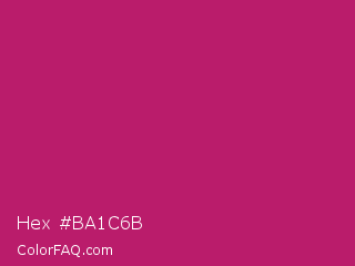 Hex #ba1c6b Color is a normal rose color and the nearest color is Hibiscus #b6316c. Hex code #ba1c6b and RGB value is rgb(186,28,107). In RGB color space, this color is composed of 73% red, 11% green, 42% blue, In CMYK color space, this color is composed of 0% cyan, 85% magenta, 42% yellow , 27% black , In HSL color space, this color has a hue angle of 330° , 74% saturation and 42% lightness.