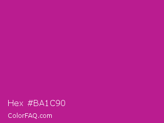Hex #ba1c90 Color is a normal magenta color and the nearest color is Red Violet #c71585. Hex code #ba1c90 and RGB value is rgb(186,28,144). In RGB color space, this color is composed of 73% red, 11% green, 56% blue, In CMYK color space, this color is composed of 0% cyan, 85% magenta, 23% yellow , 27% black , In HSL color space, this color has a hue angle of 316° , 74% saturation and 42% lightness.