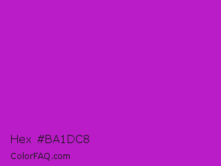 Hex #ba1dc8 Color is a normal magenta color and the nearest color is Steel Pink #cc33cc. Hex code #ba1dc8 and RGB value is rgb(186,29,200). In RGB color space, this color is composed of 73% red, 11% green, 78% blue, In CMYK color space, this color is composed of 7% cyan, 86% magenta, 0% yellow , 22% black , In HSL color space, this color has a hue angle of 295° , 75% saturation and 45% lightness.
