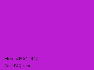 Hex #ba1dd2 Color is a normal magenta color and the nearest color is Vivid Mulberry #b80ce3. Hex code #ba1dd2 and RGB value is rgb(186,29,210). In RGB color space, this color is composed of 73% red, 11% green, 82% blue, In CMYK color space, this color is composed of 11% cyan, 86% magenta, 0% yellow , 18% black , In HSL color space, this color has a hue angle of 292° , 76% saturation and 47% lightness.