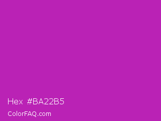 Hex #ba22b5 Color is a normal magenta color and the nearest color is Byzantine #bd33a4. Hex code #ba22b5 and RGB value is rgb(186,34,181). In RGB color space, this color is composed of 73% red, 13% green, 71% blue, In CMYK color space, this color is composed of 0% cyan, 82% magenta, 3% yellow , 27% black , In HSL color space, this color has a hue angle of 302° , 69% saturation and 43% lightness.