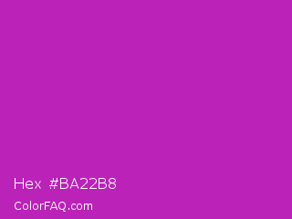 Hex #ba22b8 Color is a normal magenta color and the nearest color is Byzantine #bd33a4. Hex code #ba22b8 and RGB value is rgb(186,34,184). In RGB color space, this color is composed of 73% red, 13% green, 72% blue, In CMYK color space, this color is composed of 0% cyan, 82% magenta, 1% yellow , 27% black , In HSL color space, this color has a hue angle of 301° , 69% saturation and 43% lightness.