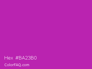 Hex #ba23b0 Color is a normal magenta color and the nearest color is Byzantine #bd33a4. Hex code #ba23b0 and RGB value is rgb(186,35,176). In RGB color space, this color is composed of 73% red, 14% green, 69% blue, In CMYK color space, this color is composed of 0% cyan, 81% magenta, 5% yellow , 27% black , In HSL color space, this color has a hue angle of 304° , 68% saturation and 43% lightness.