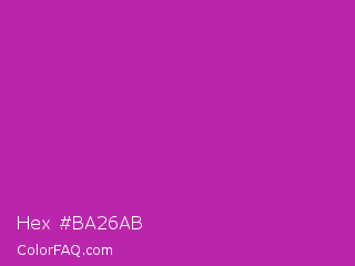 Hex #ba26ab Color is a normal magenta color and the nearest color is Byzantine #bd33a4. Hex code #ba26ab and RGB value is rgb(186,38,171). In RGB color space, this color is composed of 73% red, 15% green, 67% blue, In CMYK color space, this color is composed of 0% cyan, 80% magenta, 8% yellow , 27% black , In HSL color space, this color has a hue angle of 306° , 66% saturation and 44% lightness.