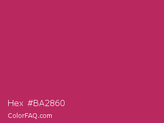 Hex #ba2860 Color is a normal rose color and the nearest color is Rich Maroon #b03060. Hex code #ba2860 and RGB value is rgb(186,40,96). In RGB color space, this color is composed of 73% red, 16% green, 38% blue, In CMYK color space, this color is composed of 0% cyan, 78% magenta, 48% yellow , 27% black , In HSL color space, this color has a hue angle of 337° , 65% saturation and 44% lightness.