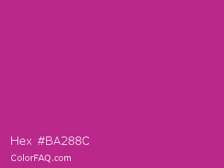 Hex #ba288c Color is a normal magenta color and the nearest color is Fandango #b53389. Hex code #ba288c and RGB value is rgb(186,40,140). In RGB color space, this color is composed of 73% red, 16% green, 55% blue, In CMYK color space, this color is composed of 0% cyan, 78% magenta, 25% yellow , 27% black , In HSL color space, this color has a hue angle of 319° , 65% saturation and 44% lightness.