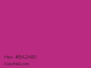 Hex #ba2a80 Color is a normal magenta color and the nearest color is Medium Red Violet #bb3385. Hex code #ba2a80 and RGB value is rgb(186,42,128). In RGB color space, this color is composed of 73% red, 16% green, 50% blue, In CMYK color space, this color is composed of 0% cyan, 77% magenta, 31% yellow , 27% black , In HSL color space, this color has a hue angle of 324° , 63% saturation and 45% lightness.