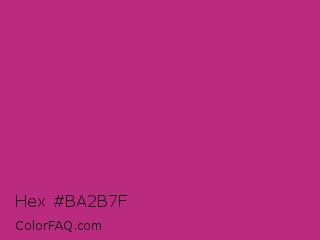 Hex #ba2b7f Color is a normal magenta color and the nearest color is Medium Red Violet #bb3385. Hex code #ba2b7f and RGB value is rgb(186,43,127). In RGB color space, this color is composed of 73% red, 17% green, 50% blue, In CMYK color space, this color is composed of 0% cyan, 77% magenta, 32% yellow , 27% black , In HSL color space, this color has a hue angle of 325° , 62% saturation and 45% lightness.