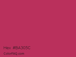 Hex #ba305c Color is a normal rose color and the nearest color is Rich Maroon #b03060. Hex code #ba305c and RGB value is rgb(186,48,92). In RGB color space, this color is composed of 73% red, 19% green, 36% blue, In CMYK color space, this color is composed of 0% cyan, 74% magenta, 51% yellow , 27% black , In HSL color space, this color has a hue angle of 341° , 59% saturation and 46% lightness.