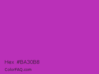 Hex #ba30b8 Color is a normal magenta color and the nearest color is Byzantine #bd33a4. Hex code #ba30b8 and RGB value is rgb(186,48,184). In RGB color space, this color is composed of 73% red, 19% green, 72% blue, In CMYK color space, this color is composed of 0% cyan, 74% magenta, 1% yellow , 27% black , In HSL color space, this color has a hue angle of 301° , 59% saturation and 46% lightness.