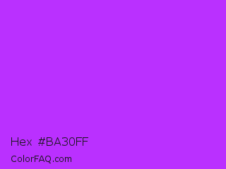 Hex #ba30ff Color is a normal purple color and the nearest color is Veronica #a020f0. Hex code #ba30ff and RGB value is rgb(186,48,255). In RGB color space, this color is composed of 73% red, 19% green, 100% blue, In CMYK color space, this color is composed of 27% cyan, 81% magenta, 0% yellow , 0% black , In HSL color space, this color has a hue angle of 280° , 100% saturation and 59% lightness.
