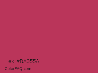 Hex #ba355a Color is a normal rose color and the nearest color is Rich Maroon #b03060. Hex code #ba355a and RGB value is rgb(186,53,90). In RGB color space, this color is composed of 73% red, 21% green, 35% blue, In CMYK color space, this color is composed of 0% cyan, 72% magenta, 52% yellow , 27% black , In HSL color space, this color has a hue angle of 343° , 56% saturation and 47% lightness.