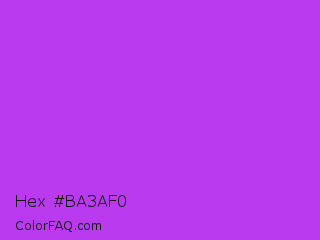Hex #ba3af0 Color is a normal purple color and the nearest color is Veronica #a020f0. Hex code #ba3af0 and RGB value is rgb(186,58,240). In RGB color space, this color is composed of 73% red, 23% green, 94% blue, In CMYK color space, this color is composed of 23% cyan, 76% magenta, 0% yellow , 6% black , In HSL color space, this color has a hue angle of 282° , 86% saturation and 58% lightness.